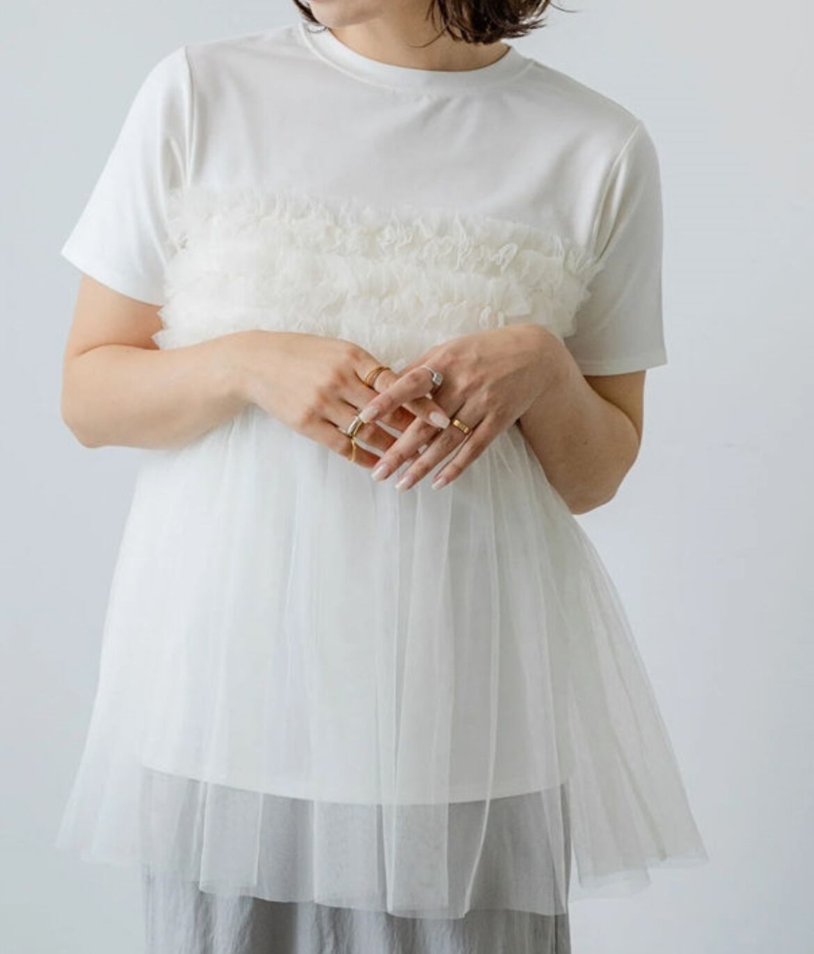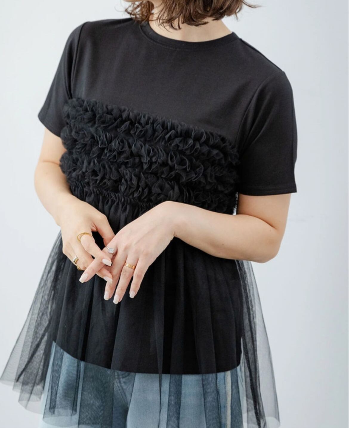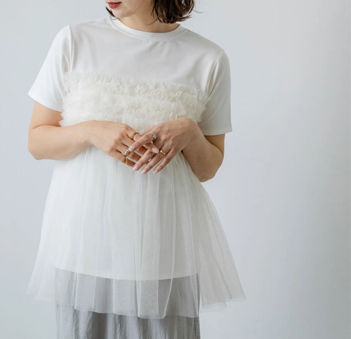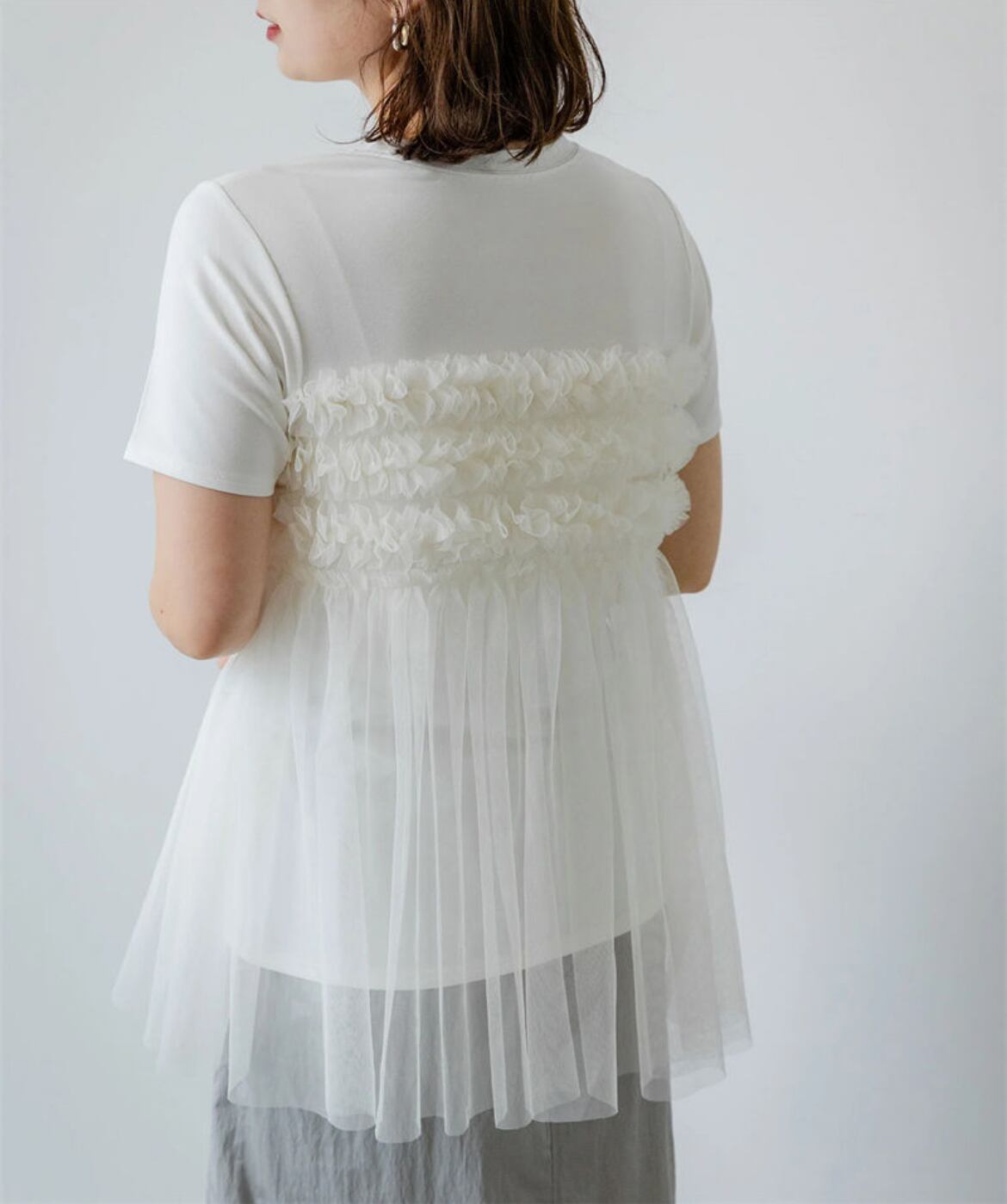 大人可愛いふんわりチュールが魅力のトップスで、特別なスタイルを楽しむ