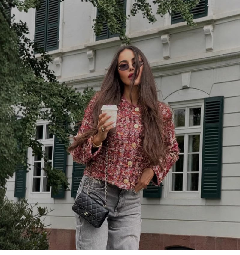 大人可愛い赤ベースの綺麗めトップスで、特別なスタイルを楽しむ