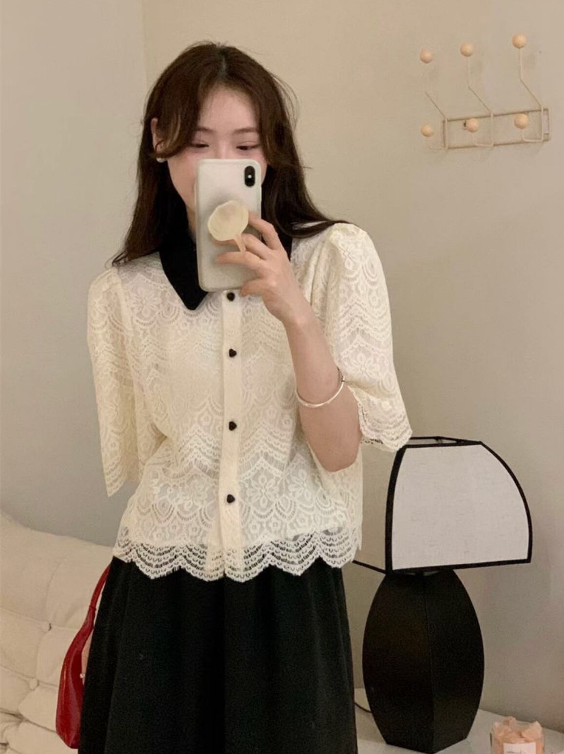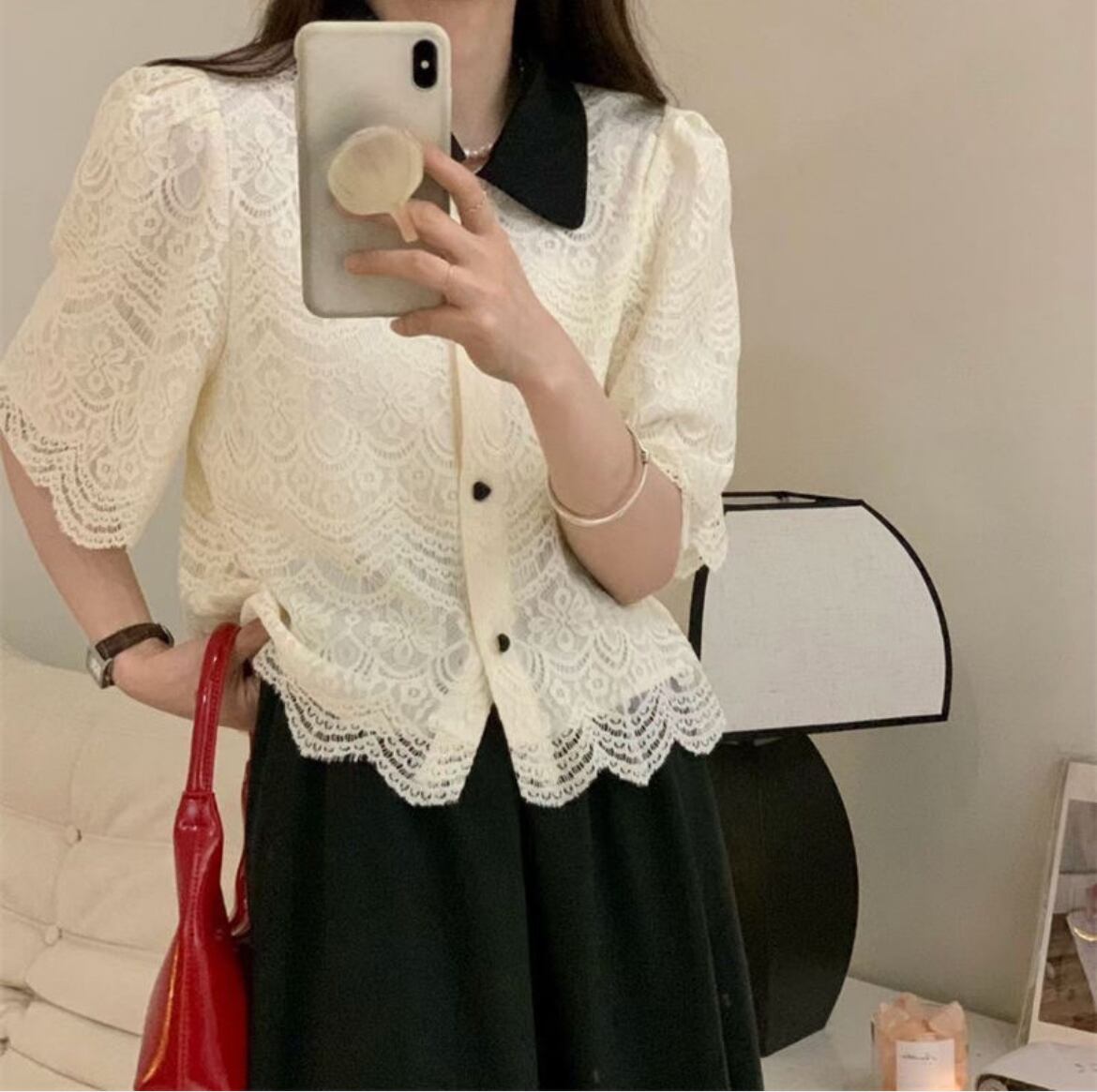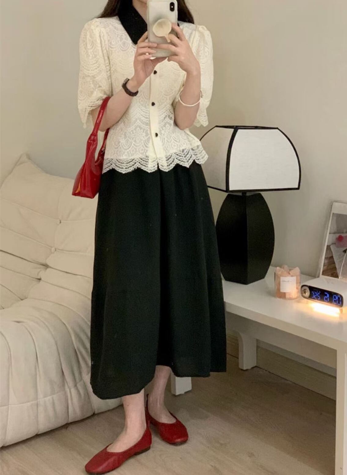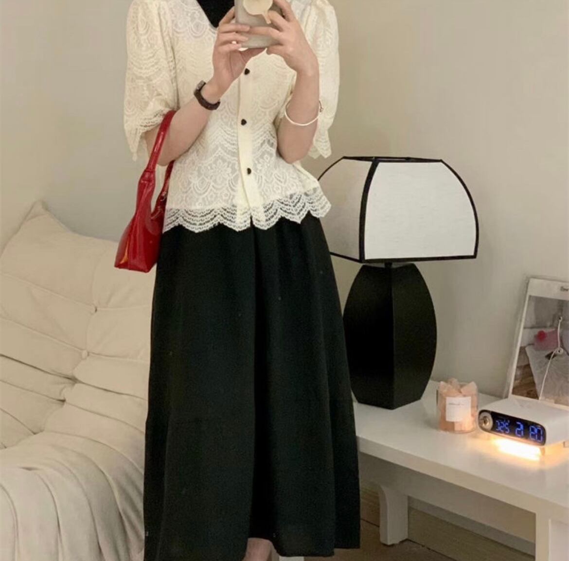 この上品なレーストップス&スカートセットアップは、黒襟の洗練されたデザインが魅力です。優雅なレース使いが顔周りを明るく魅せ、シンプルながらもエレガントな印象を与えます。軽やかな素材感は心地よい着心地を提供し、デイリーから特別な日まで幅広く活躍するアイテムです。トップスとスカートを組み合わせたスタイルは、様々なシーンで活躍し、あなたの個性を引き立てること間違いなしです。